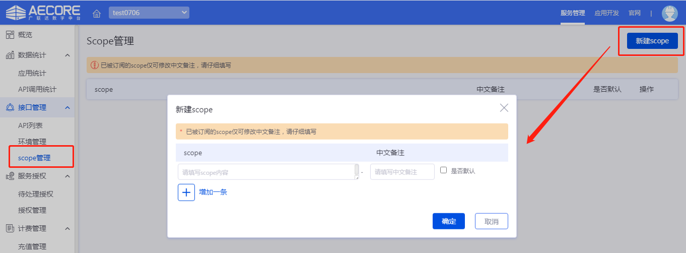 服务scope为服务权限范围,由服务负责人在scope管理页面定义,在API列表页面绑定scope与API关系(scope与API是n:n关系)