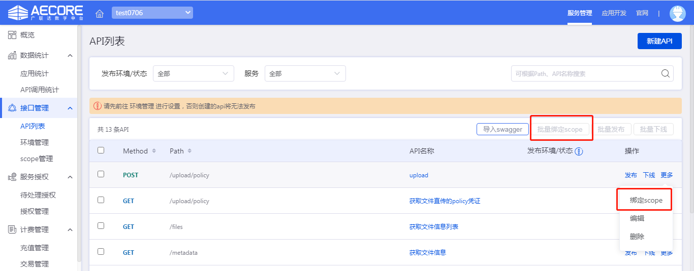 将API于scope关系绑定,可针对单个接口逐一绑定scope,也可以多选接口批量绑定