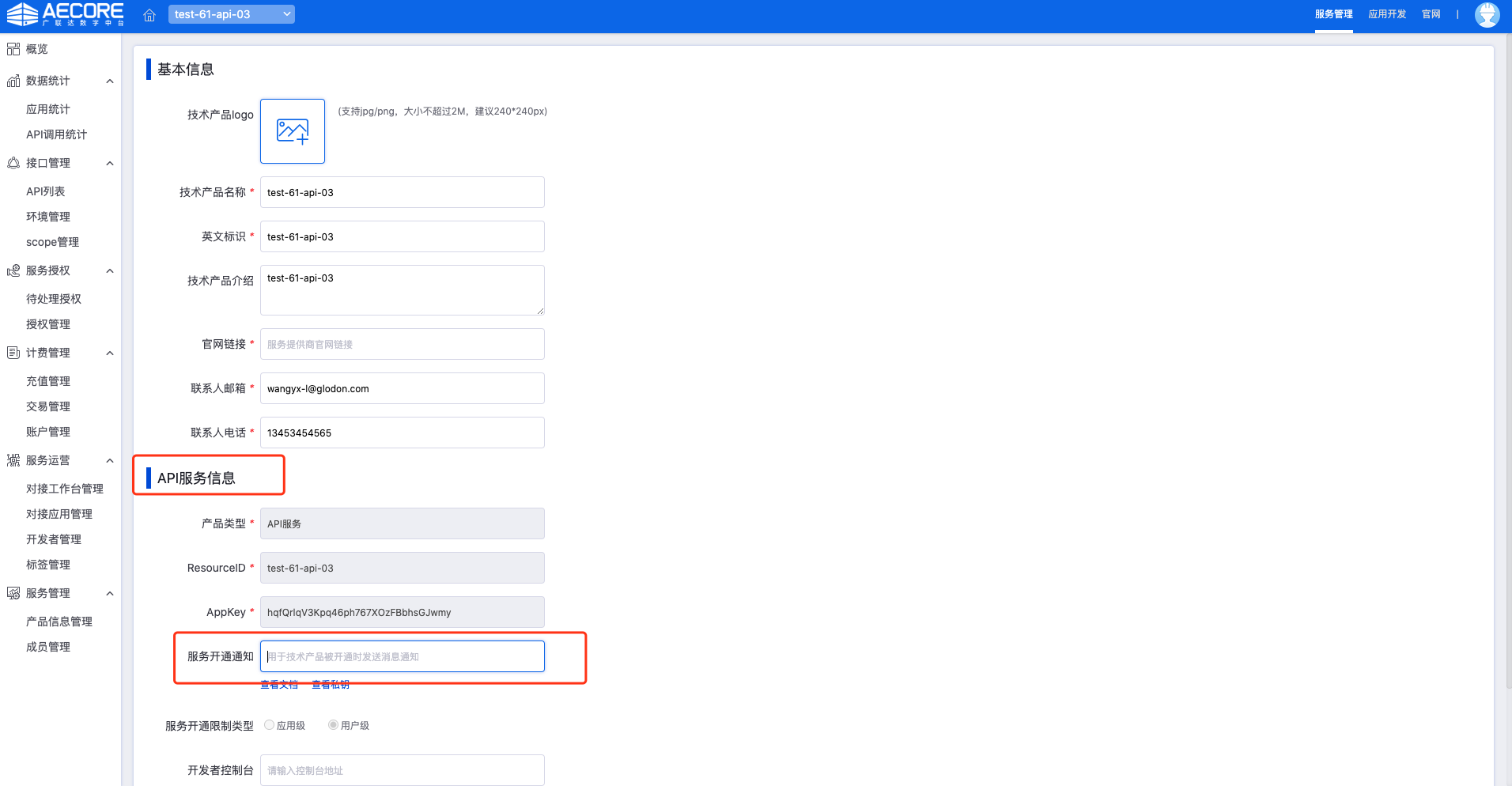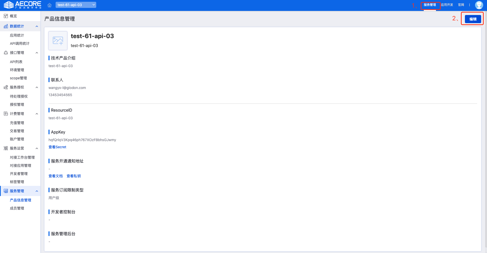 在技术服务中详情中查看密钥
