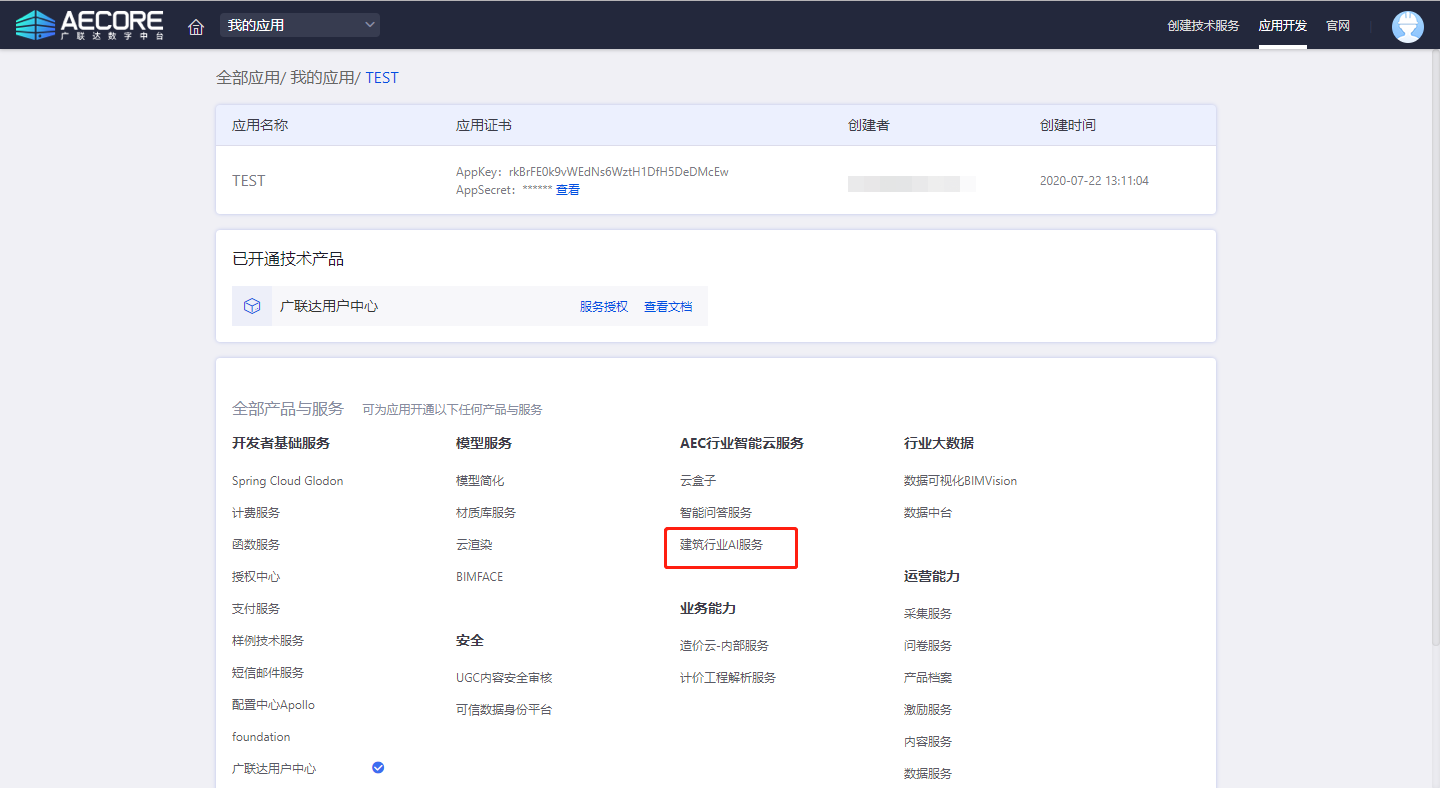 登录AECORE,并创建应用,创建应用后即可获取appkey、appsecret,这是调用服务的秘钥请妥善管理。