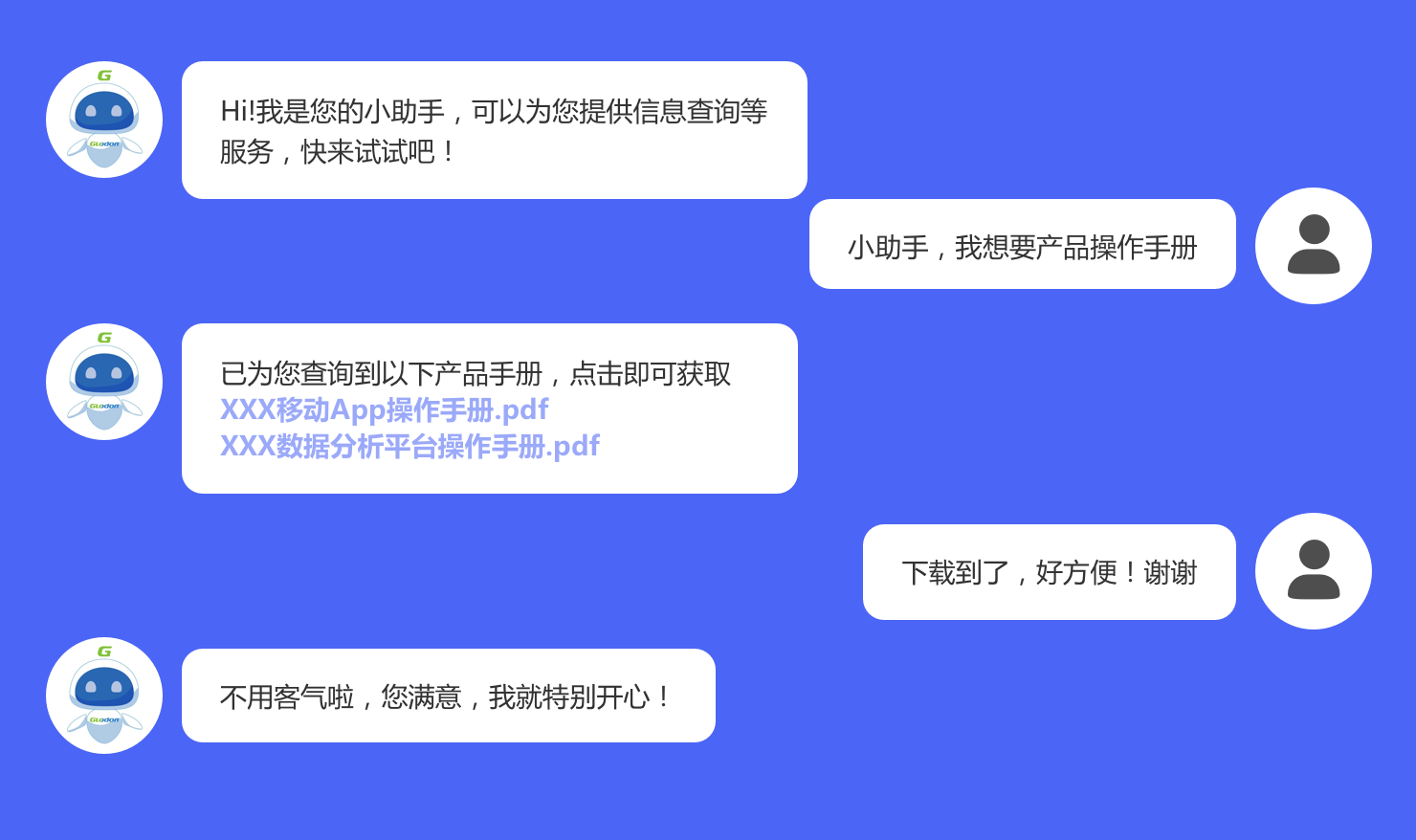 支持网站、微信公众号、桌面客户端、手机APP及灵活API等多种渠道接入机器人,灵活支撑不同的产品形态。比如,您的产品是web形态,您可以用JS组件或者嵌入问答链接的形式接入机器人;若您的产品主要应用于手机场景,可以考虑以微信公众号或者手机APP等形式与机器人进行对接,以上两种方式均不需要开发介入,零代码即可完成。若您对终端对话页面样式或功能有特殊需求,可以使用我们开放的API,完成智能对话等服务的调用。