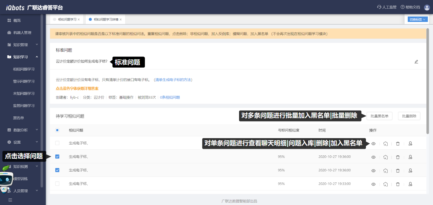 警示问题学习模块是被用户“点踩”的问题汇总,用于判断用户点踩的原因,进而完善相应的知识。