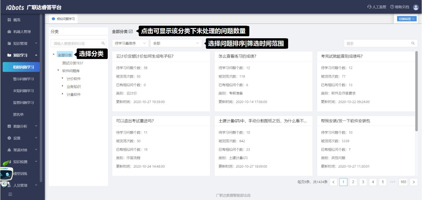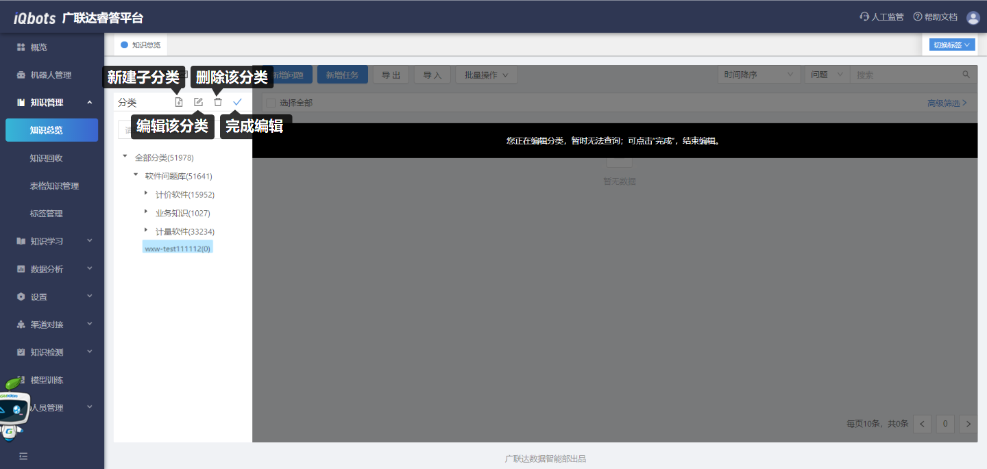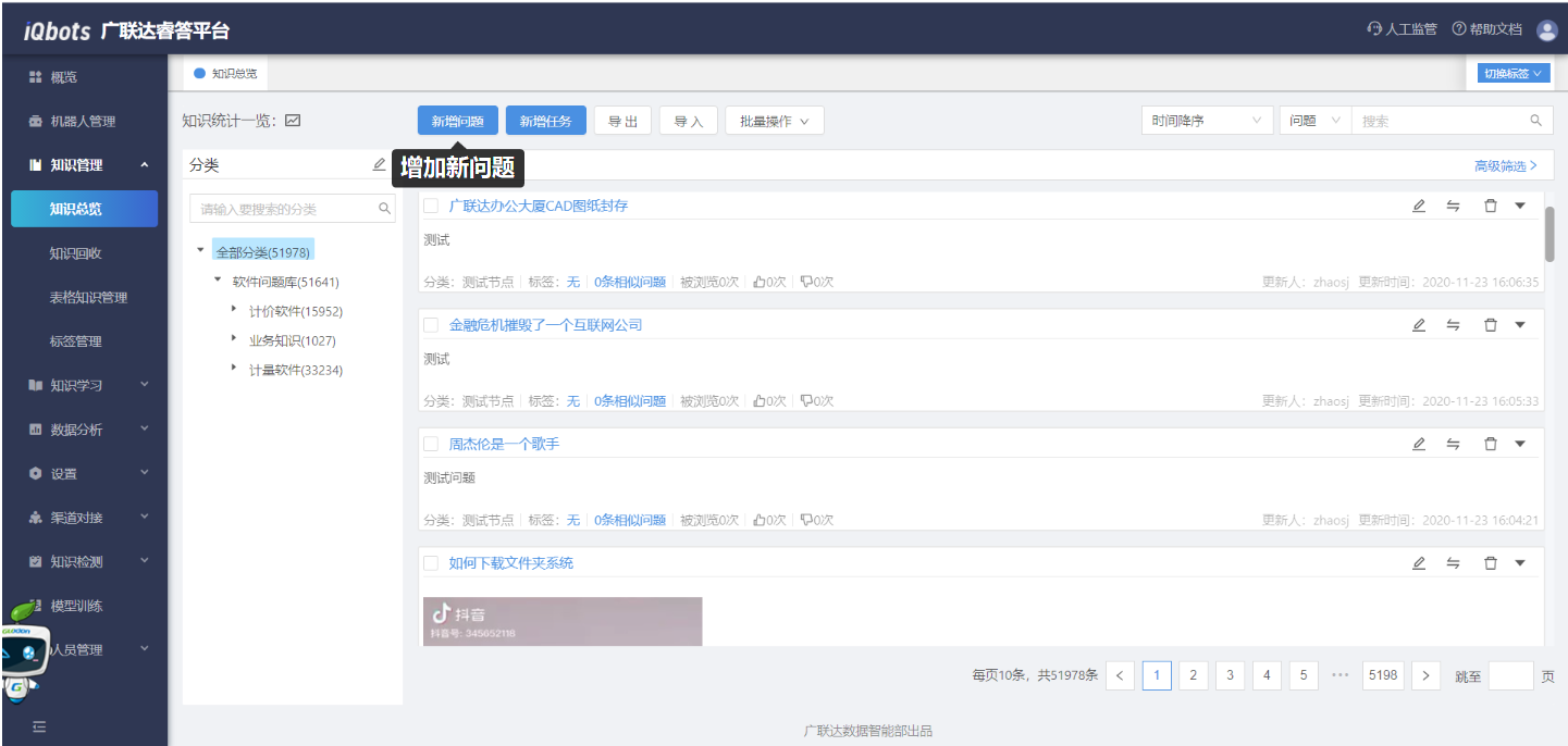 在知识总览页面,可以完成知识分类管理、问题的增删改查、问题的相似问法管理等。