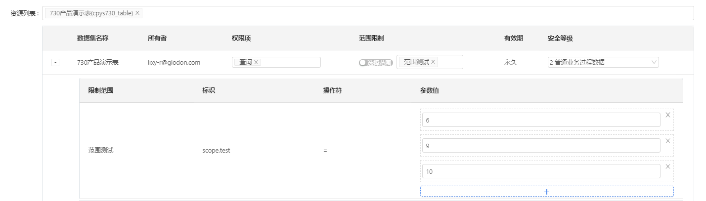 | ⑩ | 范围限制 | 是否开启范围限制(全表范围/选择范围,详见6.4范围管理),非全域资源填写 |