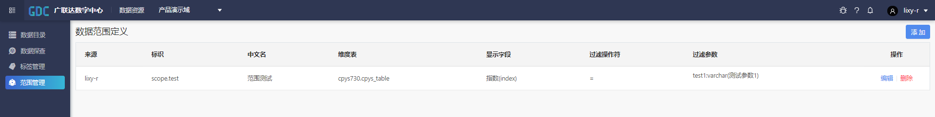 ⑧编辑,可编辑当前数据资源基本信息,内容包括中文名、英文名、描述、范围和标签。