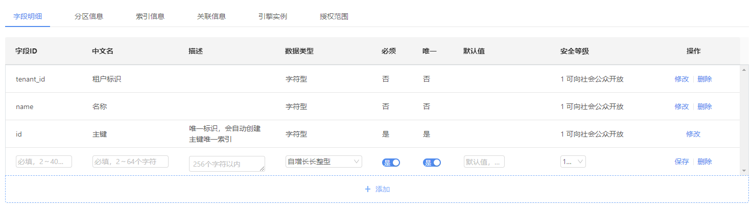 其中其他信息包括字段信息、分区信息、索引信息、关联信息、引擎实例和范围授权,在本节中,将对这几类信息进行详细介绍。