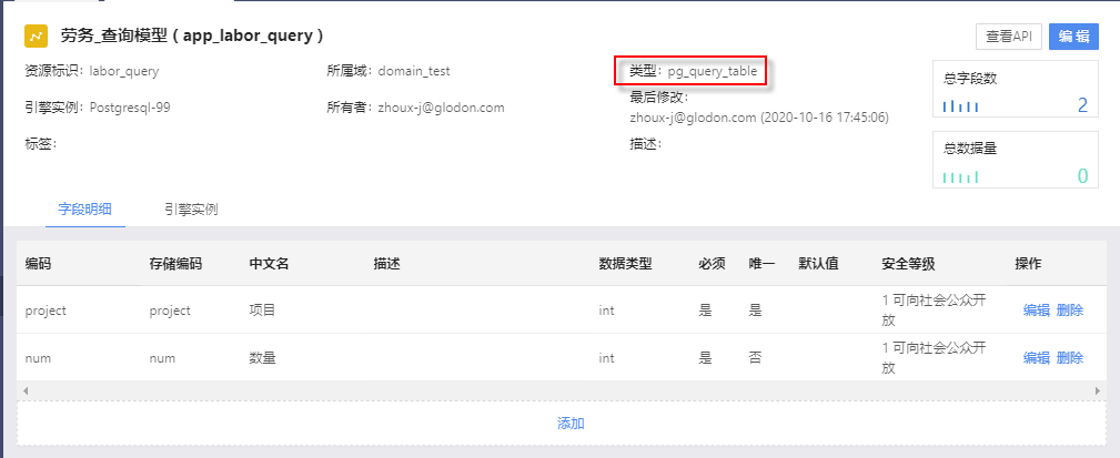 ③根据②中选择的数据资源,显示对应数据资源信息,包括数据资源名称、资源标识、所属域、类型、引擎实例、所有者、最后修改用户名称、最后修改时间、范围和标签信息,以及数据资源的总数据量和总字数段。