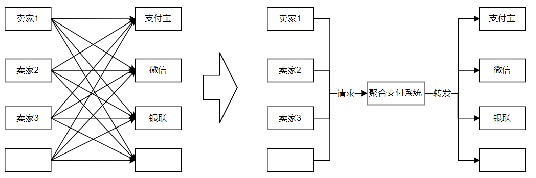 聚合支付系统,位于商户与支付机构或银行之间,收敛商户与支付机构及银行间的一切交互。