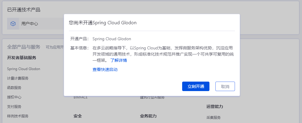 应用创建后选择Spring Cloud Glodon并开通本服务