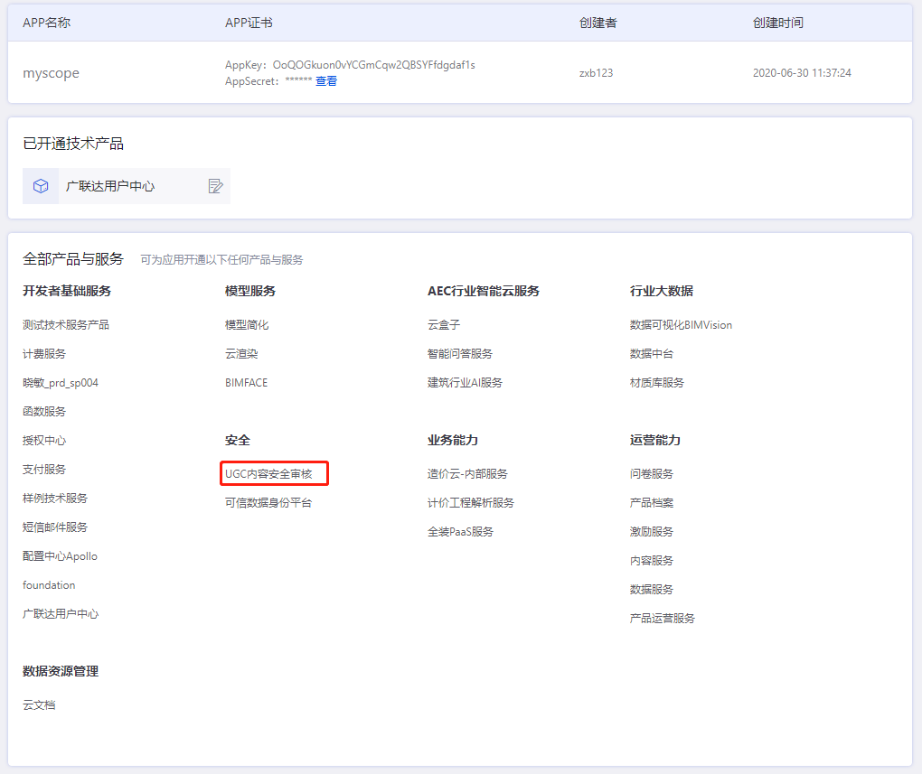 登录AECORE,并创建应用,创建应用后即可获取appkey、appsecert,这是调用服务的秘钥请妥善管理。
