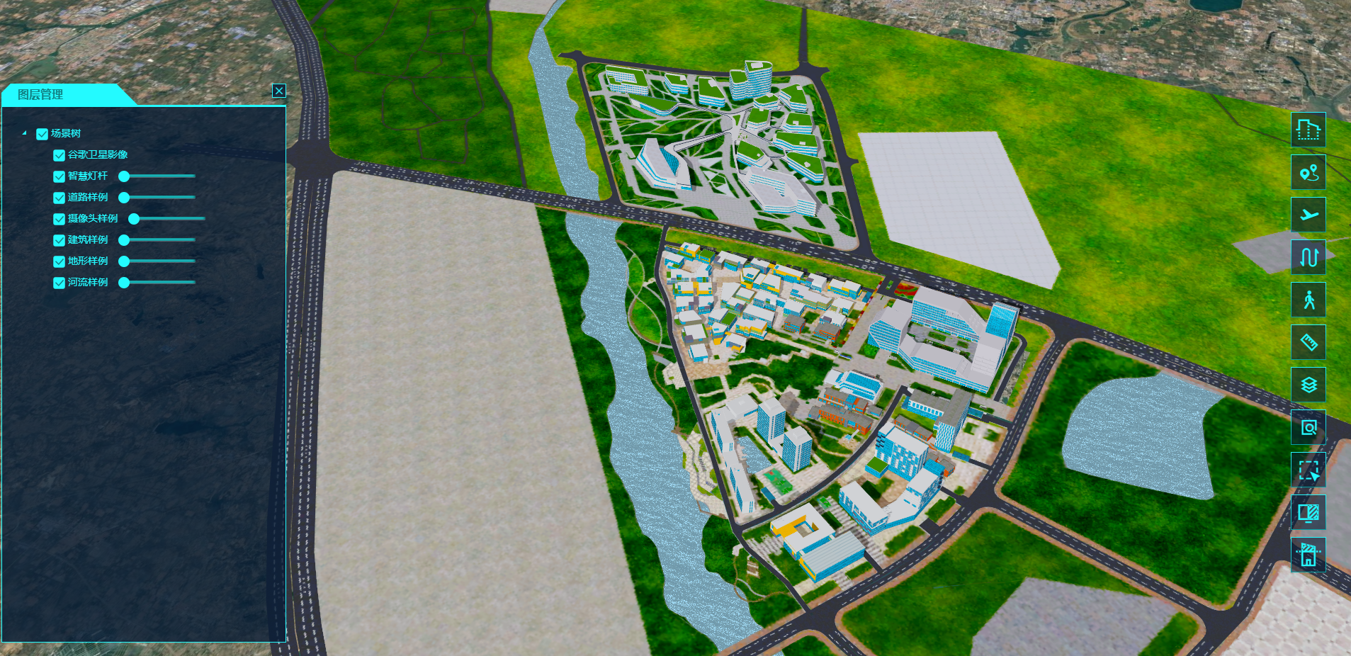 系统打开新的页面进行应用场景的预览,场景会根据配置的图层服务、视角和工具条,进行应用场景的可视化浏览,如下图: