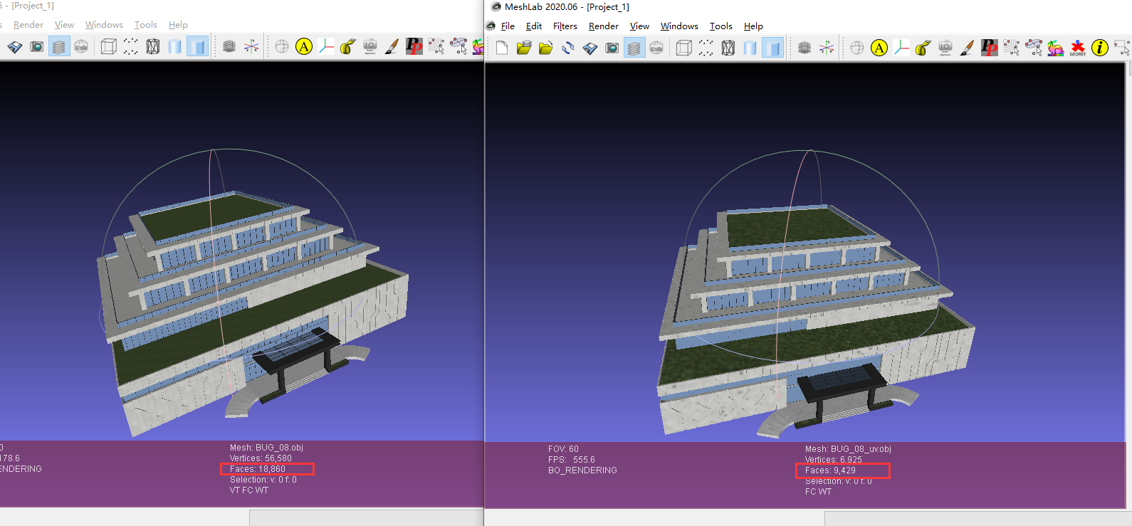 该模型的简化结果如下图,可以看到设置压缩率为0.5,faces面片减少了50%,但依然保持了很好的整体效果。